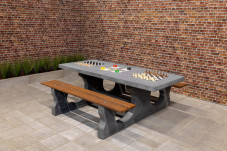 La table multi-jeux Deluxe comprend trois jeux : un jeu de dames et un jeu d'échecs sur les côtés et le jeu de Ludo au milieu. Un lot de pions et de pièces pour chaque jeu est inclus en standard, de sorte que vous pouvez tout de suite vous installer à la table et jouer un jeu. Les jeux sont intégrés dans le plateau de la table et ne peuvent donc ni s’envoler ni être volés. Bien entendu, les pièces et les pions sont des pièces détachées et doivent donc être rangés soigneusement lorsque vous avez fini de jouer. Les tables de jeux sont coulée d’une seule pièce en béton gris et a deux bancs en bambou.